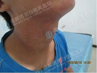 (3月26日初诊时,患者颈部部片状白斑明显,边缘清晰,处于稳定期)