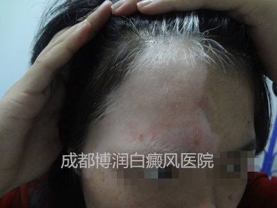 初诊前,王萍眼部和额头部有大面积白斑,我院专家通过检测得出,王萍是由于微循环异常和铜离子低下造成的,且皮损区黑色素不完全性脱失,白斑边缘清晰,处于稳定期。