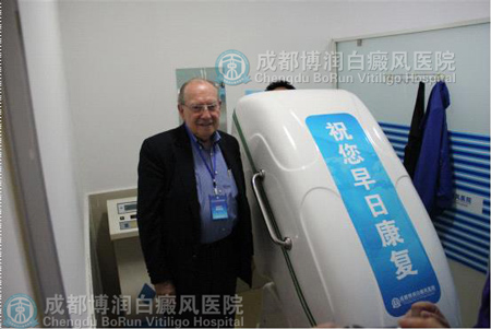 【图:世界308之父、美国华盛顿大学医学院皮肤科主任、美国西雅图皮肤中心创始人伯纳德·葛菲教授在成都博润白癜风医院熏蒸治疗室留影】